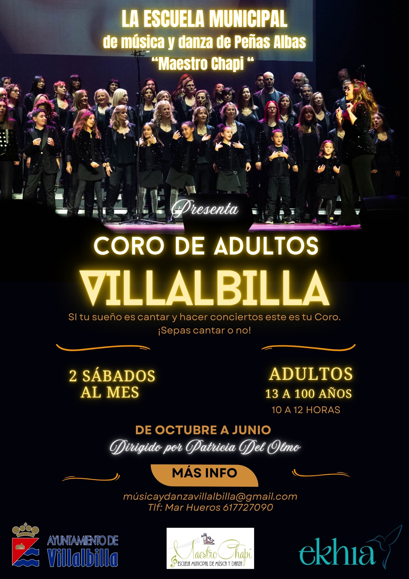 ENSAYAMOS 2 SÁBADOS AL MES DE 10 A 12 HORAS EN PEÑAS ALBAS. EN LA ESCUELA MAESTRO CHAPÍ. AVENIDA DE ESPAÑA, 2, VILLALBILLA . CUOTA DEL AYUNTAMIENTO 36 EUROS. GESTIÓN DIRECTA PARA INSCRIPCIÓN CON ELLOS EN EL 617-72-70-90 ( MAR HUEROS)